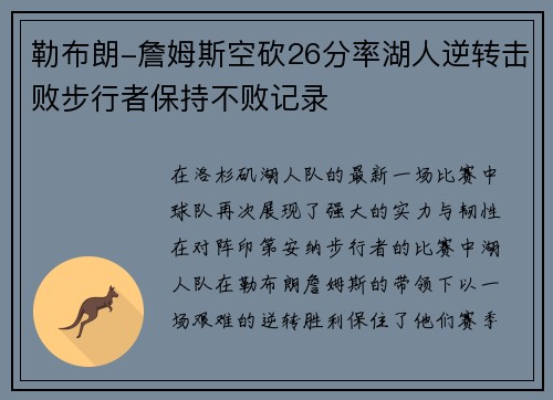 在洛杉矶湖人队的最新一场比赛中,球队再次展现了强大的实力与韧性。在对阵印第安纳步行者的比赛中,湖人队在勒布朗-詹姆斯的带领下,以一场艰难的逆转胜利保住了他们赛季的完美开局。在这场比赛中,詹姆斯独砍26分,成为了全场最耀眼的明星。他的表现不仅帮助湖人度过了比赛中的危机,也为球队继续保持不败记录奠定了基础。